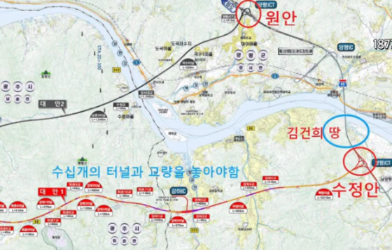 23년 7월, 국토교통부의 '양평고속도로 수정안'에 대한 계획은 김건희 일가 뿐 아니라, 김충식이 2000년부터 땅을 사놓은 곳이고, 김충식은 놀랍게도 '강상면 병산리 1000-2번지'를 2002년부터 고속도로화를 계획(아래 사진, 김충식이 양평군에 제출한 토지이용계획에 고속도로 계획선이 양평고속도로 변경안과 거의 일치)한 것으로도 드러났다. (2000년 김충식 매입, 2002년 산지전용허가지 복구준공, 2002년 주택 및 창고로 허가, 2005년 지목변경)