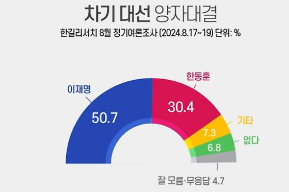 1. 차기 대선 양자대결 : 이재명 50.7%, 한동훈 30.4%