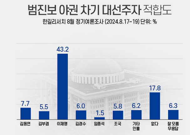(2024년 8월 14일,16일, 1005명, 무선 97%, 유선 3%, 신뢰 수준에 ±3.1% p)