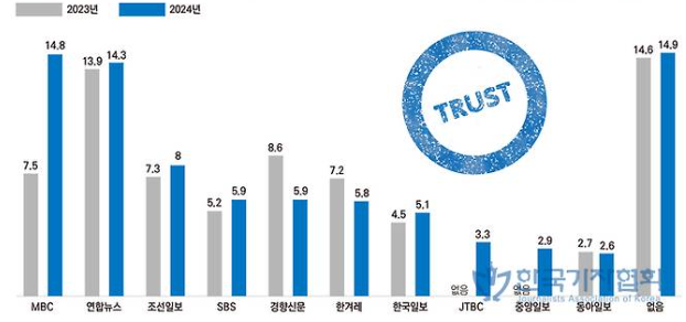 1. 가장 신뢰하는 언론사(본인 소속사 제외) ? MBC 14.8%, 연합뉴스 14.3%, 조선일보 8%