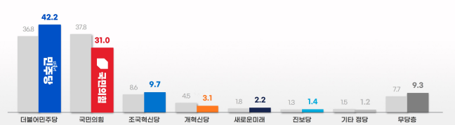 2. 정당지지도 : 더불어민주당 42.2%, 국민의힘 31.0%, 조국혁신당 9.7%, 개혁신당 3.1%