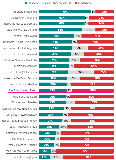 **조 바이든 긍정평가 37% 부정 평가 55%(12위) , 기시다 긍정평가 15% 부정 평가 68%(25위)
