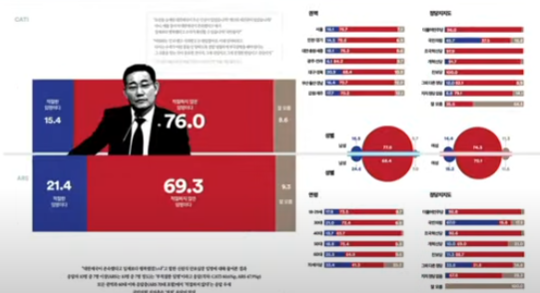 '반대' 응답자 가운데 △여성(80.7%) △40대(83.8%) △50대(80.0%)에서 특히 높았으며, 진보층(반대 86.6%, 찬성 10.1%)과 중도층(반대 75.0%, 찬성 22.9% )의 반대가 보수층(반대 59.3%, 찬성 37.5%)보다 월등히 높았다.