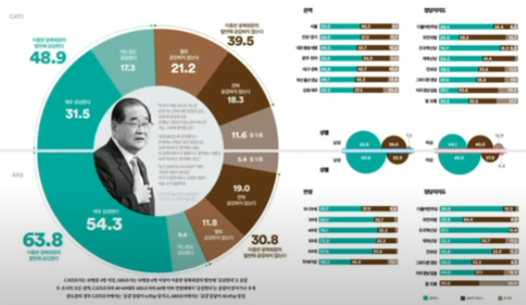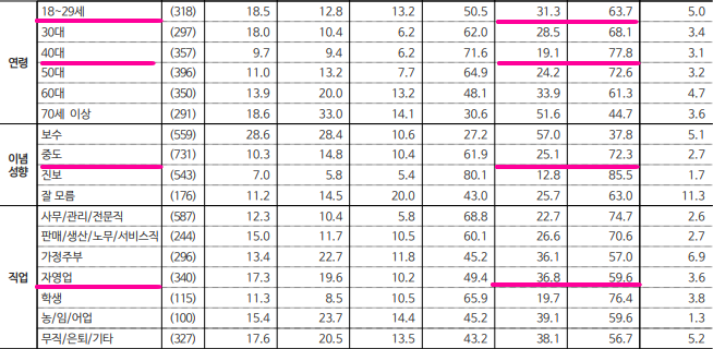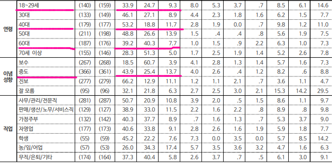 보수층( 30.4% vs 49.5%), 중도층( 50.6% vs 29.1%), 진보층( 79.8% vs 11.3% )