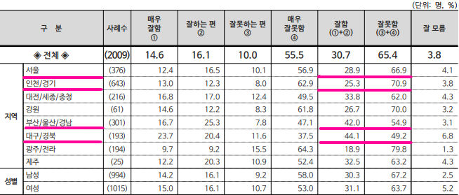 호남권( 65.1% vs 17.4%), 강원·제주(61.7% vs 31.9%), 인천·경기(53.9% vs 26.1%), 충청권(51.5% vs 30.2%), 서울(48.7% vs 34.8%), 부산·울산·경남(42.6% vs 33.4%), 대구 ·경북(35.7% vs 44.2%)