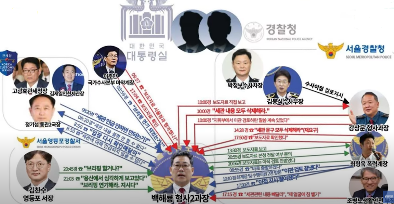 4. 이에 경찰 윗선에서 전화로 '세관연루 관련내용은 브리핑에서 삭제하라'고 두번 이나 압력