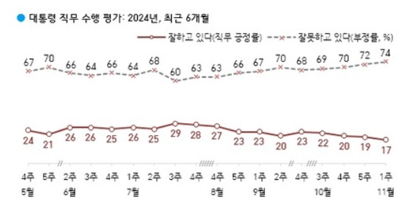 1. 윤대통령 직무수행 평가: 잘하고 있다 17%, 잘못하고 있다 74%(취임후 최저)