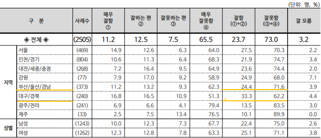 △'서울' 27.9%, 부정 70.5% △'인천·경기' 긍정 22.5%, 부정 75.6% △'대전·세종·충남북' 긍정 23.7%, 부정 73.5% △'광주·전남북' 긍정 14.9%, 부정 85.1% △'대구·경북' 긍정 38.1%, 부정 59.9% △'부산·울산·경남' 긍정 37.3%, 부정 61.0% △'강원·제주' 긍정 20.7%, 부정 76.8%