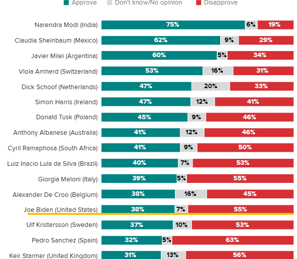 **조 바이든 긍정평가 38% 부정 평가 55%(13위) , 이시바 시게루 긍정평가 23% 부정 평가 54%(21위)