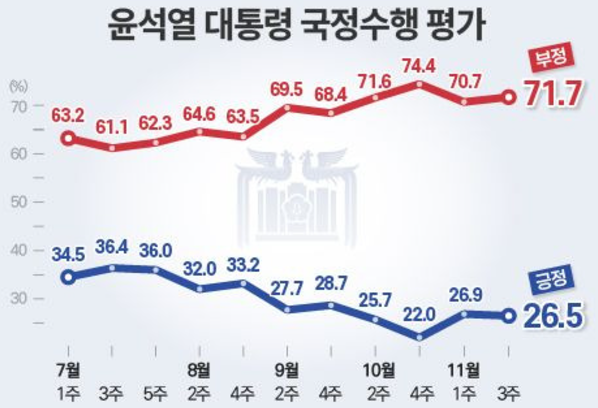 1. 윤대통령 국정수행 평가? 부정 71.7%, 긍정 26.5%(역대 최저 지지율)