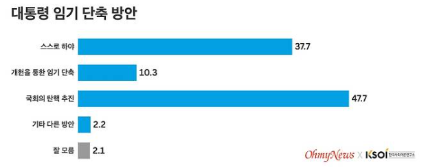 4. 대통령 임기 단축방안 : 국회 탄핵추진 47.7%, 스스로 하야 37.7%, 개헌통한 임기단축 10.3%