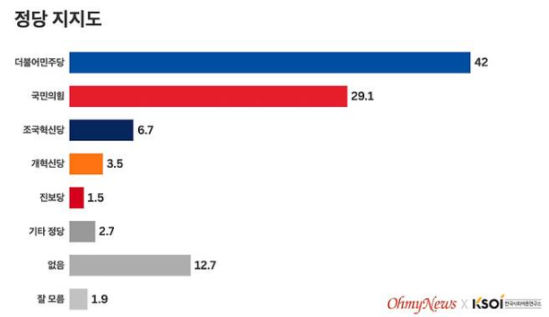 2. 정당지지도 : 민주당 42.0%, 국힘 29.1%, 혁신당 6.7%, 개혁신당 3.5%