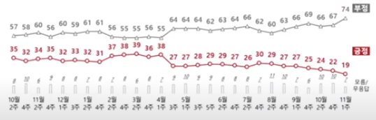 1. 윤대통령 직무수행 평가? 잘하고 있다 19%, 잘못하고 있다 74%(최저치 갱신)