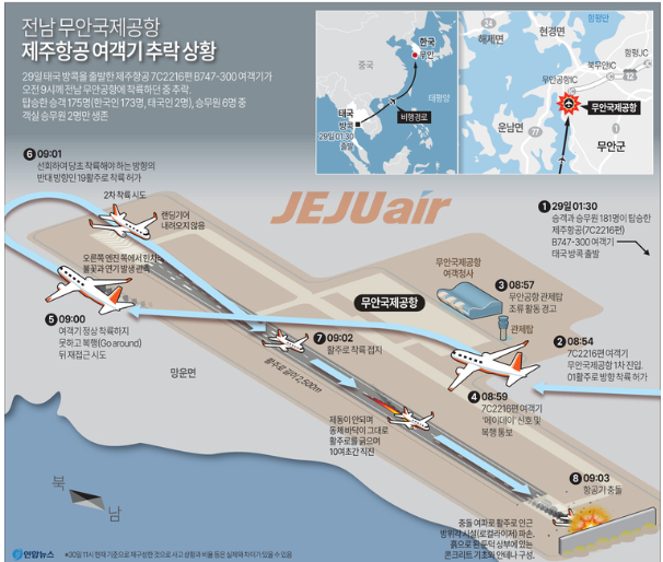 24년 12월 30일 태국에서 무안공항 도착예정였던 181명을 태운 제주항공기가, 조류 충돌로 기체 오른쪽 엔진 연기났고, 9시 3분 250Km로 착륙시도하다 활주로 남쪽 끝 '로컬라이저(착륙 유도 안전시설)에 부딪힌 뒤 외벽 담벼락까지 충돌, 폭발하여 179명 사망, 2명 생존