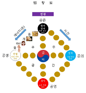 - 법황도 : 한국(배달)의 운영체계, 단군주의(천부경)을 근원으로 전 세계가 한반도를 중심으로 체제근원을 살린다.