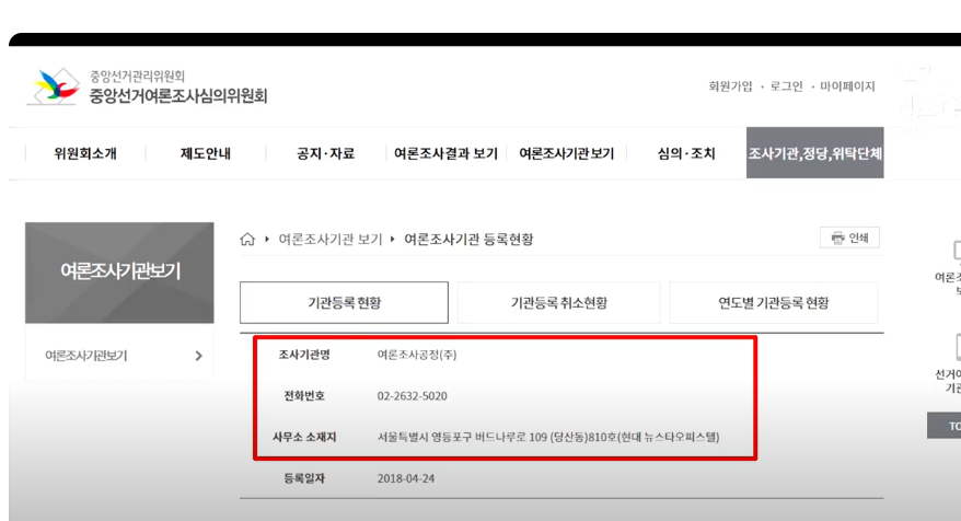 중앙선관위(여론조사 심의위원회)에 등록된 곳에 상주인원도 사무실도 실체가 없는 것으로 나타났다.