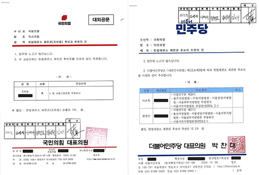 3. <24년 12월 9일> 국힘은 조한창 후보, 민주당은 마은혁, 정계선 후보를 헌재 재판관으로 추천하겠다는 공문을 우원식 국회의장에게 보내옴