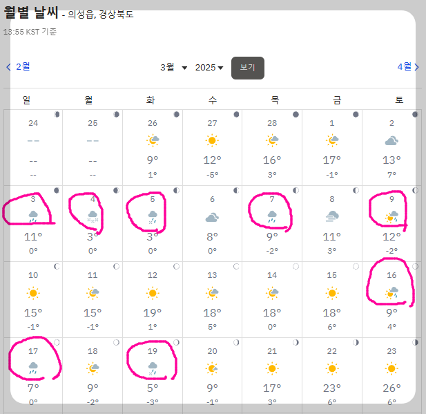 최초(3월 21일) 발화지인 의성에는 이틀전 비가 왔을 뿐 아니라, 그전 20일 동안 8일동안이나 비가 왔고, 안동은 비온 날이 9일이다.