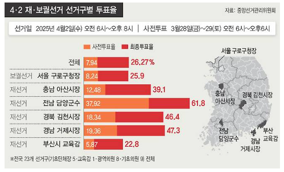 ◈ 4.2 재보선 최종 투표율 : 26.55%(2017년 이후 최저), 선거구별 투표율