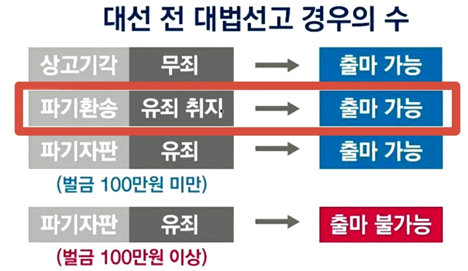 다. '파기자판 1(벌금 100만원 미만 확정판결)' => 대법원이 항소심(2심) 파기하면서 대법원 스스로 판결해 확정(파기자판) 피선거권에는 영향이 없고, 대선에 출마가능하나, 정치적으로 불리.