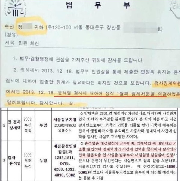 이 감찰조사는 2012년 5월까지 계속됐고, 정대택이 재차 진정서를 접수하자, 2013년 12월 18일 윤석열에 정직 1개월 처분이 내려진다. 이는 상당히 중한 징계로, 형사처벌도 가능한 사안이다. 김건희의 재산은 윤석열이 서울중앙지검장으로 취임 후, 코바나콘텐츠로의 협찬이 폭증했음에 기여된 바가 크다. (윤석열의 뇌물죄 혐의 부분)