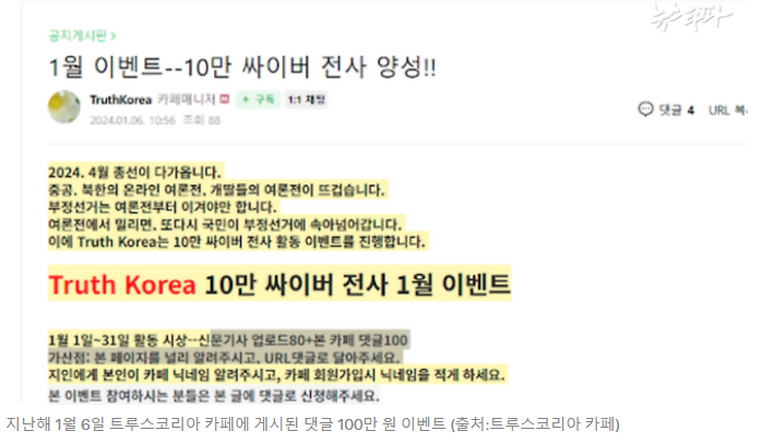 4) 매달 댓글 활동 잘한 회원 100만원 포상(지난 총선)