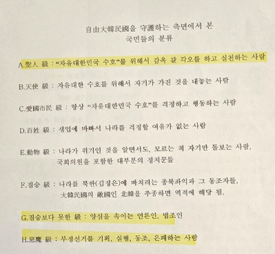8) 국민을 8등급으로 나워 관리/취급 : 성인, 천사, 애국시민, 백성, 동물,짐승, 짐승보다 못한 급, 악마(아래 그림 참조)