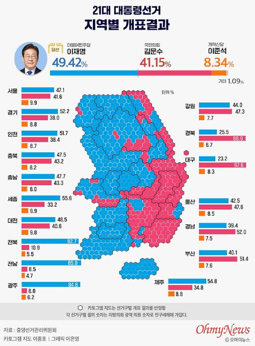 ▲서울(49.3, 40.1, 9.2) ▲부산(42.7, 49.0, 6.9) ▲대구(24.1, 67.5, 7.3) ▲인천(53.6, 37.4, 7.5) ▲광주(81.7, 10.5, 5.9) ▲대전(51.8, 38.3, 8.8), ▲울산(46.5, 44.3, 6.9) ▲경기(55.8, 34.6, 8.5) ▲강원(48.8, 42.2, 6.7) ▲충북(51.1, 40.2, 7.9) ▲세종 충남(51.3, 39.7, 8.2) ▲전북(79.6, 11.8, 6.7) ▲전남(80.8, 10.9, 6.4) ▲경북(28.2, 64.0, 6.7) ▲경남(43.4, 48.8, 6.3) ▲제주(57.9, 31.2, 9.3)