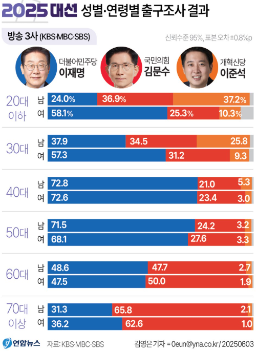 ▲ 20대(이재명 41.3%, 김문수 30.9%) ▲ 30대(이 47.6%, 김 32.7%) ▲ 40대(이 72.7%, 김 22.2%) ▲ 50대(이69.8%, 김 25.9%), ▲ 60대(48.0%, 김 48.9%), ▲ 70대이상(이 34.0%, 김 64.0%)