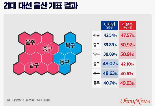6) 울산 지역 : 42.54%는 민주당 대통령이 얻은 최초, 최다 득표율