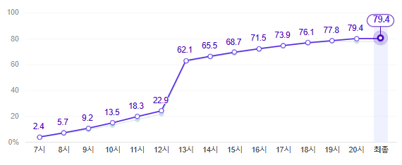 1) 시간대별 투표율(당일, 사전투표율(재외, 선상, 거소) 34.74% 합계) : 79.4%
