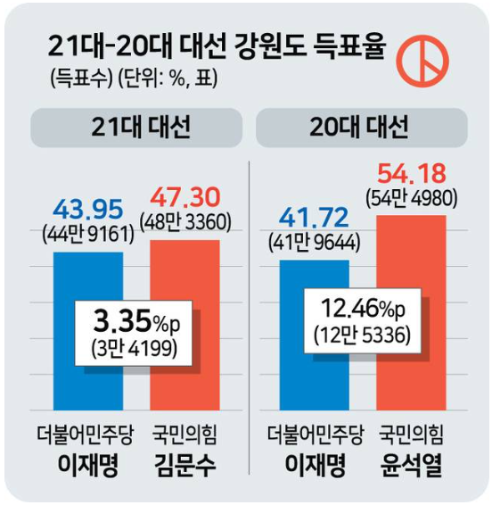 * 김문수 앞선 곳 : 강릉(이41.42%, 김 49.96%), 동해(이42.16%, 김 49.72%), 삼척(이39.08%, 김 53.13%), 태백(이 42.20%, 김 51.43%), 정선(이 42.95%, 김 51.15%), 속초(이 44.62%, 김 47.52%), 고성(이 41.25%, 김51.41%), 양양(이41.26%, 김 52.74%), 인제(이 42.63%, 김47.12%), 홍천(이41.77%, 김 50.96%), 횡성(이 40.94%, 김 52.79%), 영월(이 42.47%, 김 51.32%)