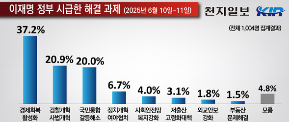 5. 이재명 정부 시급 해결 과제 : 경제회복 활성화 37.2%, 검찰 사법개혁 20.9%, 국민통합 갈등해소 20.2%