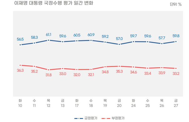 1. 이대통령 국정수행 평가 : 잘 함 59.7%, 잘 못함 33.6%