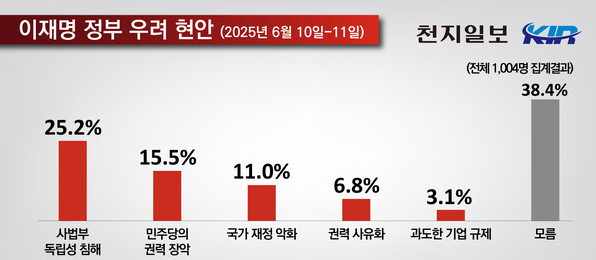7. 이재명 정부 우려 현안 : 사법부 독립성 침해 25.2%, 민주당 권력장악 15.5%, 국가재정악화 11.0%