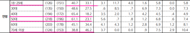 ▲20대(54.8% 대 42.6%), ▲ 30대(53.1% 대 40.0%), ▲ 40대(75.6% 대 19.7%), ▲ 50대(68.9% 대 23.3%), ▲ 60대(59.2% 대 31.1%), ▲ 보수 성향이 강한 70세 이상(긍정 46.3% 대 부정 35.3%)