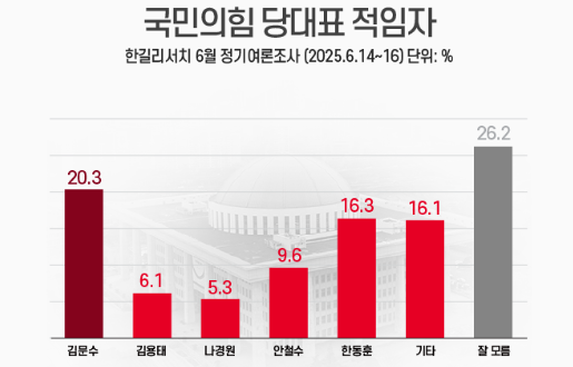 4. 국민의힘 차기 당대표 : 김문수 20.3%, 한동훈 16.3%, 안철수 9.6%
