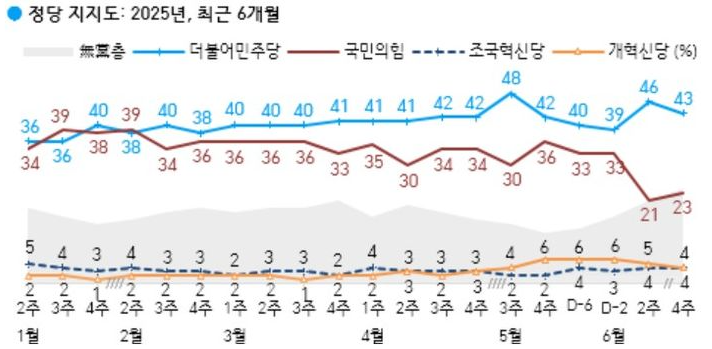 2. 정당지지도 : 민주당 43%, 국힘당 23%, 개혁신당 4%, 조국혁신당 4%, 진보당 1%