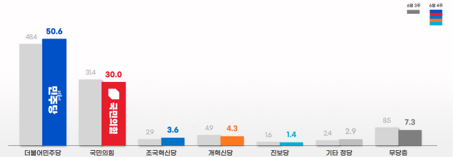 2. 정당지지도 : 더불어민주당 50.6%, 국민의힘 30.0%, 개혁신당 4.3%, 조국혁신당 3.6%, 진보당 1.4%