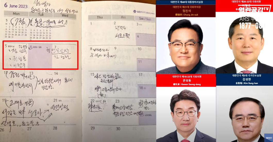 16. 정진석, 권성동, 이철규, 김성한(안보실장) 23년 6월 5일~7일 : 4명의 이름이 함께 메모=> 계엄 기획 의혹