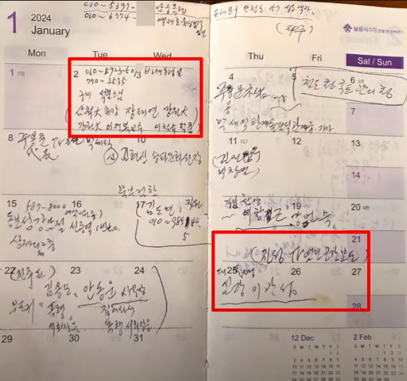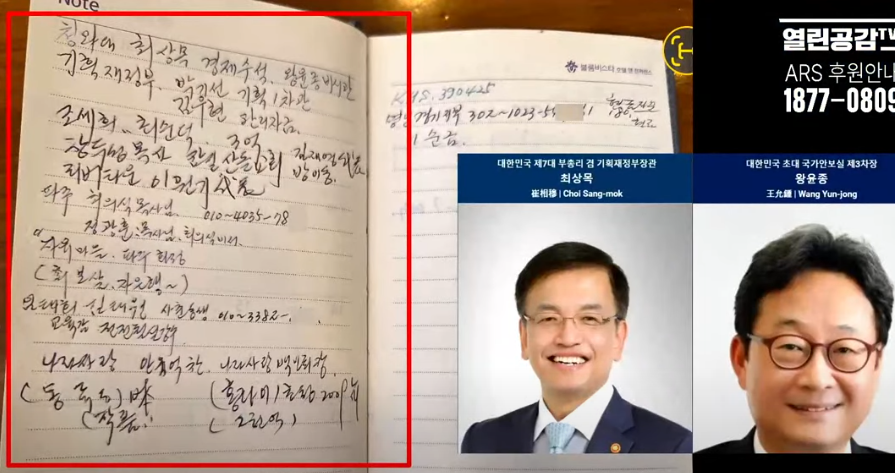 36. 그 외 : 대통령실(비화폰, 010-5923-5013, 770-2535, 김건희 직통번호), 삼척대 총장, 장태연 강원대, 인재복 교수, 철도청 국토관리청, 곽창근 원주 검찰 지청장, 국가원로회의 사무차장 배인관, 서희건설(목동), 방위산업 및 사우디관련 1조 원 규모의 환경정화 작업 관련, 원유와 갈산연 수입, 고 장재원(23년 3월 2일), 임명진목사(23년 3월 29일), 진형구(한동훈 장인인 검사장 출신), 윤석열, 오세훈, 이수동, 유학성, 이용선(문재인 정부 시민사회수석) 등이 기재되어 있다.