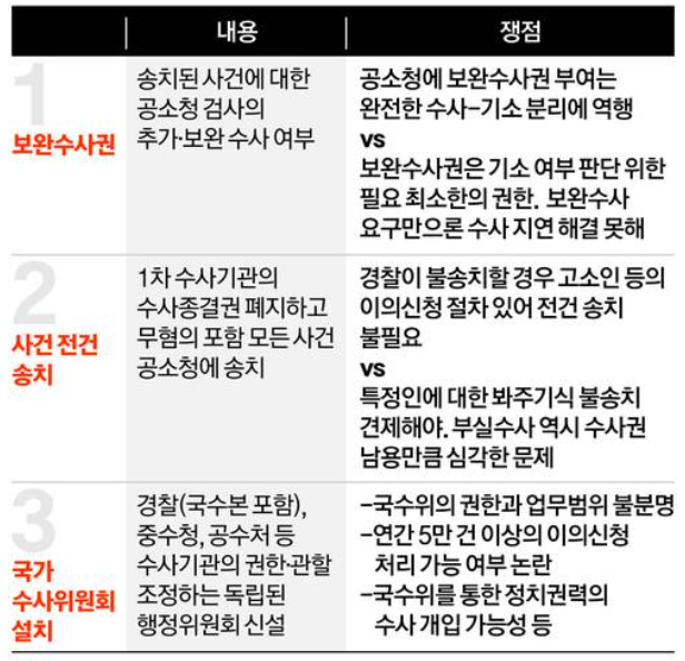 => 추가 논의 : 공소청에 '보완수사권, 부여 여부, 국가수사위원회 설치 여부 등 세부 사항 다듬을 계획
