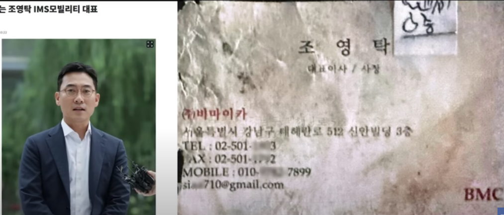 김예성은 2011년 카쉐어링 및 고급 외제차 구독 서비스를 하는 스타트업 '비마이카(IMS모빌리티)'를 '조영훈'과 같이 설립하면서 사내이사가 되고, 대표이사는 '조영탁'이란 사람이다. 조영탁의 명함은 김충식의 사무실에서 발견된다.