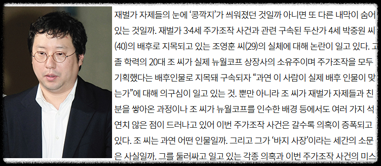 볼케이노 웨이터였던 '조영훈'(고졸출신, BMW외판원 출신) : 재벌 3~4세 들과 함께 수백억 원대 대형 '주가조작' 기획(2008년 28세에 두산그룹 4세 박중원이 인수한 것처럼 허위 공시한 '뉴월코프'를 '재벌테마주'르 만들어 3배 이상의 차익을 냈고, 100억 원 이상을 횡령하여 구속, 이때 조영훈을 변호했던 자가 '양재택'변호사
