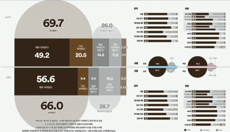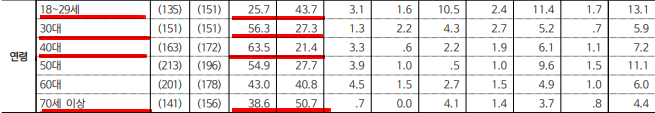 ▲20대(긍 48.8% 부 43.3%) ▲30대(긍 59.5% 부 38.8%) ▲40대(긍 69.1% 부 29.0%) ▲50대(긍 65.9% 부 30.4%) ▲60대(긍 62.9% 부32.6%) ▲70세 이상(긍 52.2% 부 39.5%)