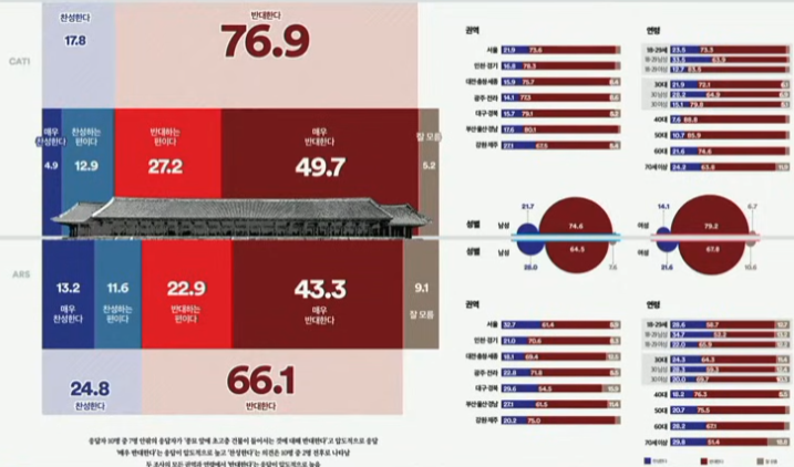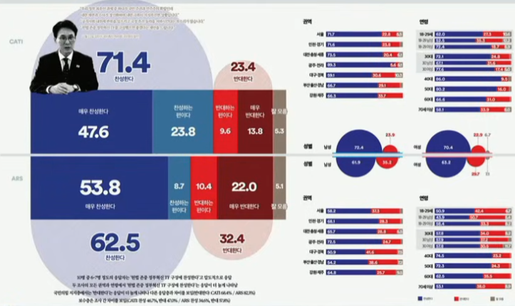 ▲서울(긍 57.7% 부 37.4%) ▲경기·인천 (긍 60.2% 부 35.9%) ▲충청(긍 56.5% 부 36.4%) ▲전라(긍 85.3% 부 13.7%)▲강원·제주 (긍 67.4% 부 29.2%) ▲대구·경북(TK) (긍 50.6% 부 43.2%) ▲부산·울산·경남(PK) (긍 54.8% 부 39.8%)