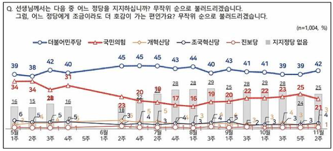 2. 정당지지도 : 민주당 42%, 국힘당 21%, 조국혁신당 4%, 개혁신당 3%