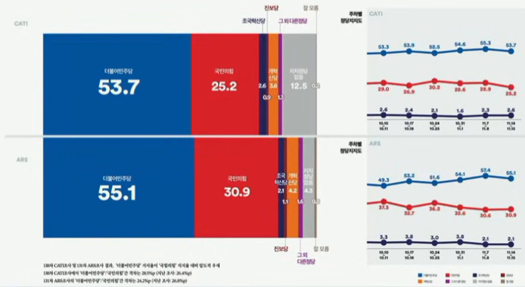 2. 정당지지도 : 민주당 47.5%, 국힘당 34.8%, 조국당 2.9%, 개혁신당 3.8%, 진보당1.1%