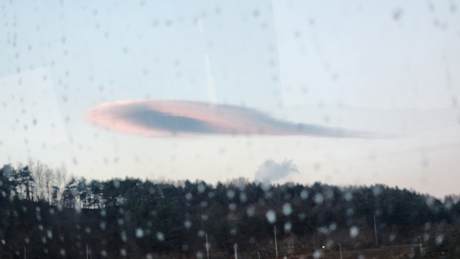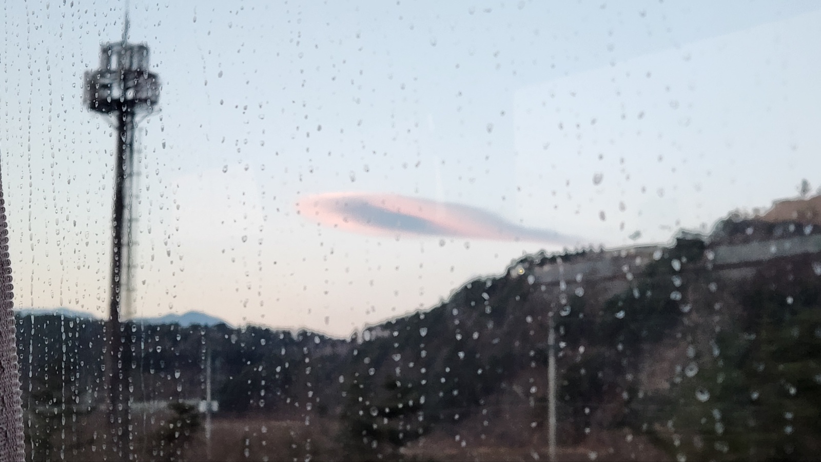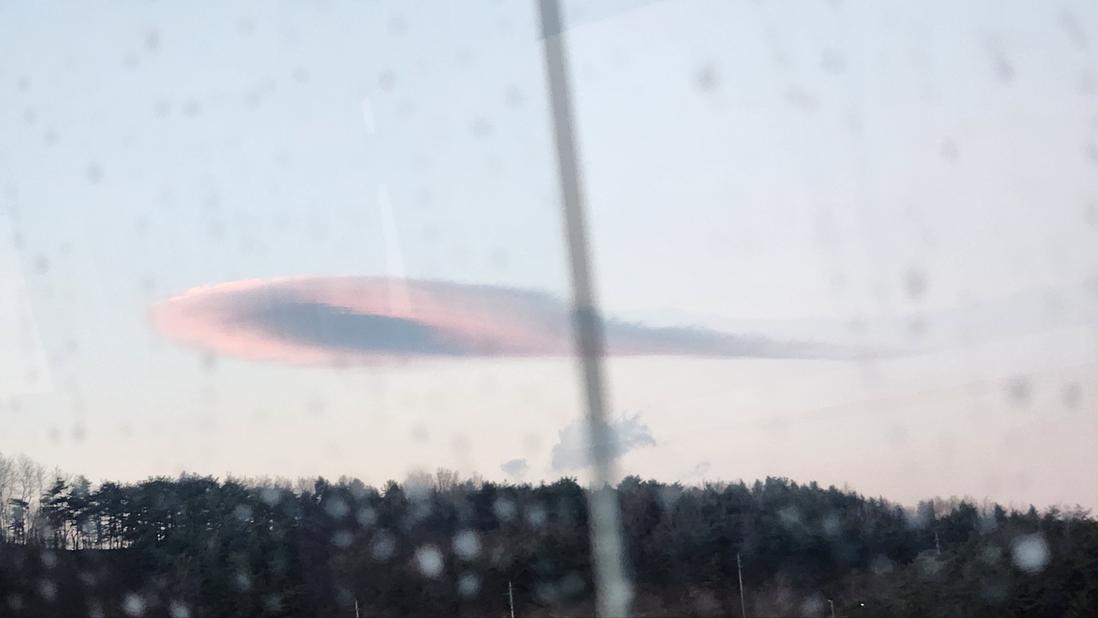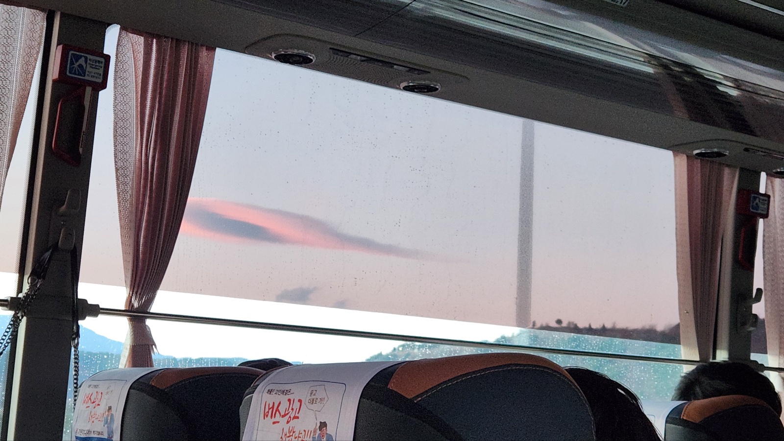 무슨 UFO같기도 하고, 볼록렌즈같기도 한..해가 질 무렵이라 그런지 구름색에 분홍색이 서렸다. (비가 오는건 아니고, 버스유리가 조금 지저분해서 ㅠ)