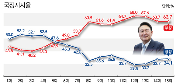 1. 윤 대통령 국정운영평가 : 부정 평가 63.7%(0.0%), 긍정평가 34.1%(0.4%↑)
